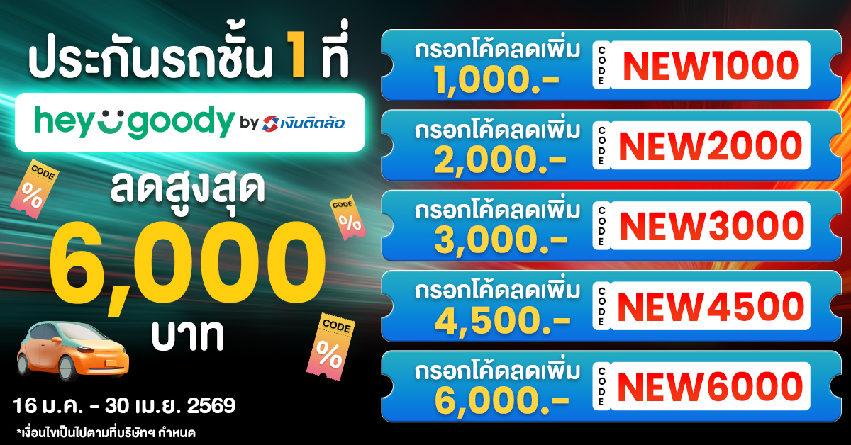 • ใส่โค้ด NEW6000 รับส่วนลด 6,000 บาท เมื่อซื้อประกันรถยนต์เบี้ย 40,000 บ.ขึ้นไป