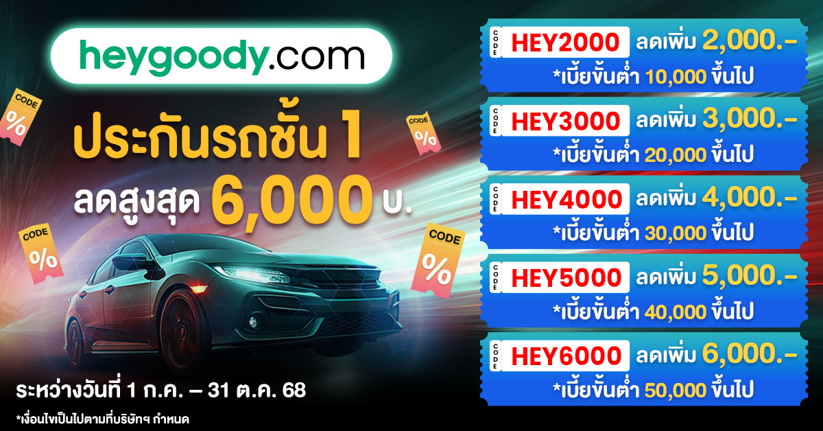 - ใส่โค้ด HEY6000 รับส่วนลด 6,000 บาท เมื่อซื้อประกันรถยนต์เบี้ย 50,000 บ.ขึ้นไป