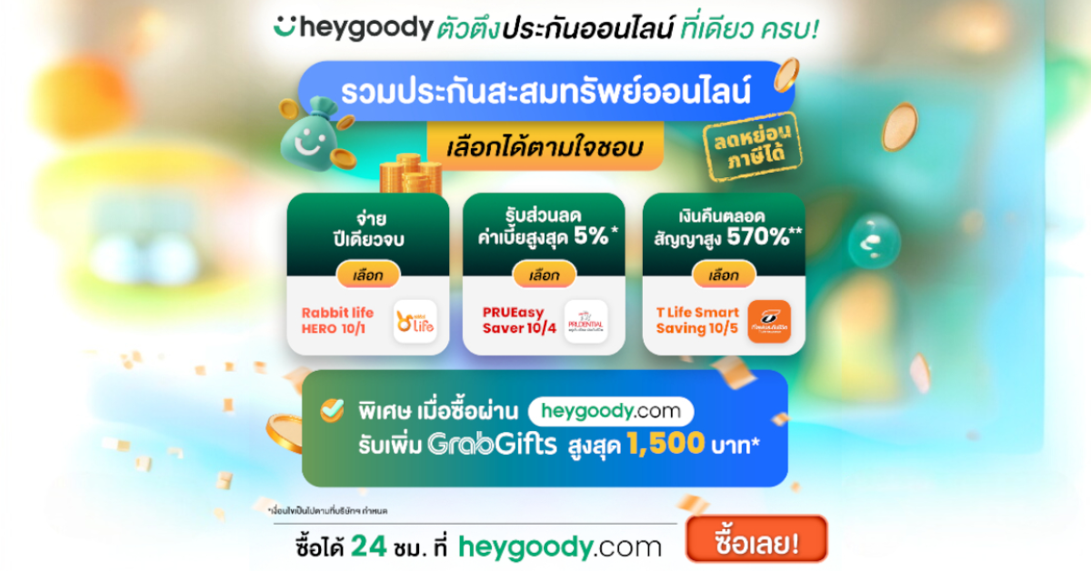 เมื่อซื้อประกันสะสมทรัพย์ที่ heygoody รับ Grabgifts สูงสุด 1,500 บาท